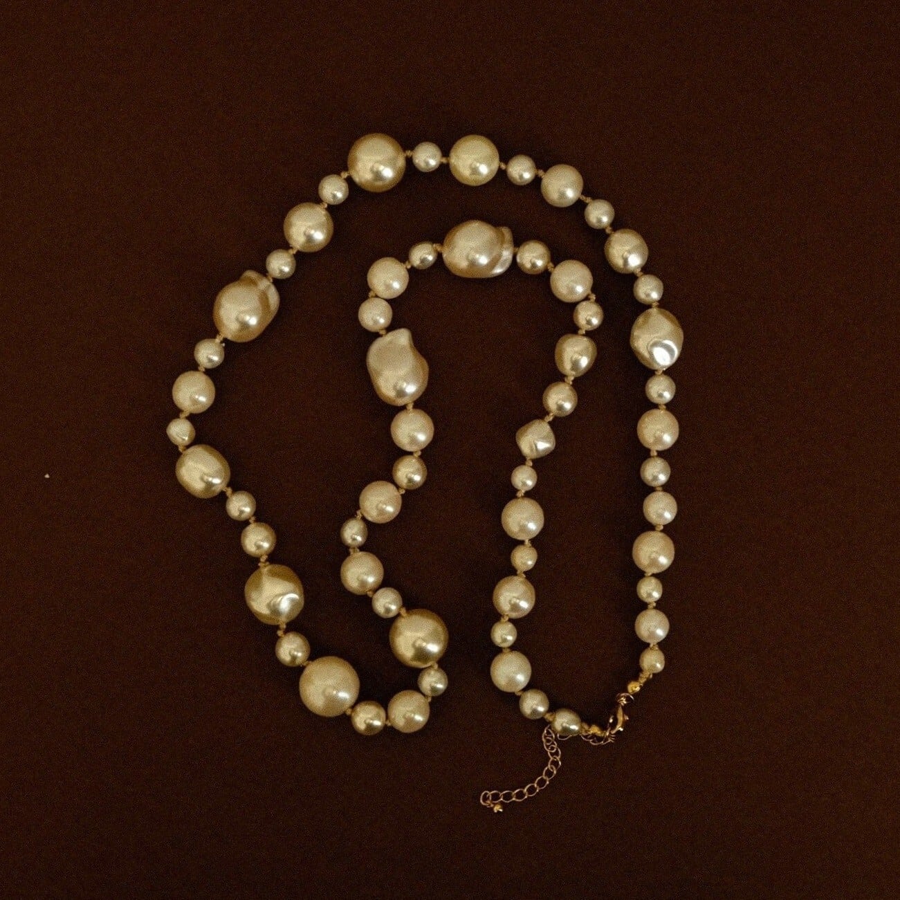 シルクコードでイミテーションパールをひとつひとつ結んで製作したネックレス。